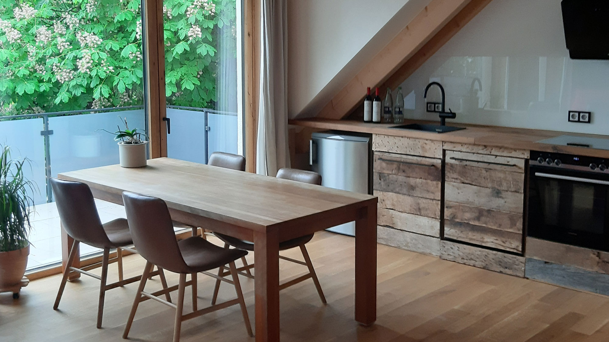 Barrierefrei und rollstuhlgerecht ausgeführt, mit Aufzug. Kombination Sichtbeton im Kellerbereich und mondholzgeschlagene Vollholz-Außenwände (Thoma), Innenseite sichtbares Holz, Außenseite zusätzlich ökologische Holzfaserdämmung und verputzt. Holz-Ständerbauweise bei den Innenwänden. Decken in massiver Balkenlage ausgeführt. Böden teilweise massive Eichendielen, ebenfalls mondholzgeschlagen oder Fliesen in den Bädern bzw. Kellerbereich. Im Gesamten Haus Holz-Alufenster mit Wildeiche. In den Schlafzimmerbereichen teilweise Zirbenholz verwendet. Dachstuhl mit sichtbaren Balken umgesetzt. Photovoltaik-Stromerzeugung inkl. Batteriespeicher. Heizungssystem: Luft-Wärmepumpe, Fußbodenheizung in den Bädern und Niedrigtemperaturheizkörper im Wohnbereich. Treppenstufen, Küchen und teilweise Möbel wurden aus über einhundert Jahre alten Eichenbalken aus dem Abbruchhaus gefertigt und somit wieder verwendet. Fertigstellung Winter/Frühjahr 2021.